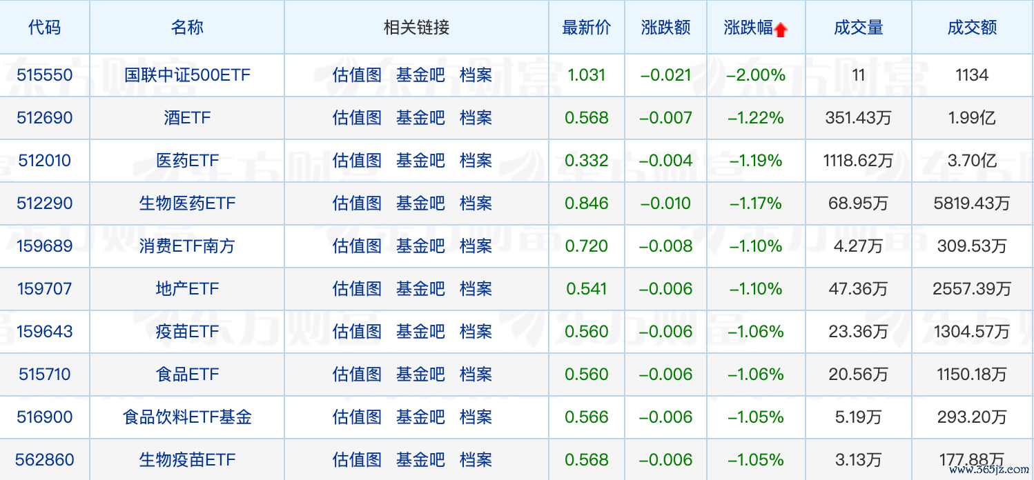下跌方面,国联中证500ETF领跌2.00%;此外,医药股集体调整,康惠制药跌停,多只生物医药ETF回调。