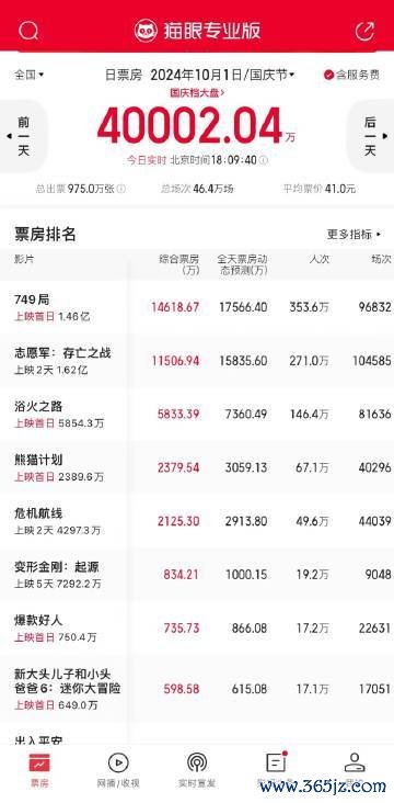 据猫眼专业版数据牛牛股票配资,截至10月1日18时09分,2024年国庆节(10月1日)大盘票房破4亿牛牛股票配资,《749局》《志愿军:存亡之战》《浴火之路》分列国庆节票房榜前三位。
