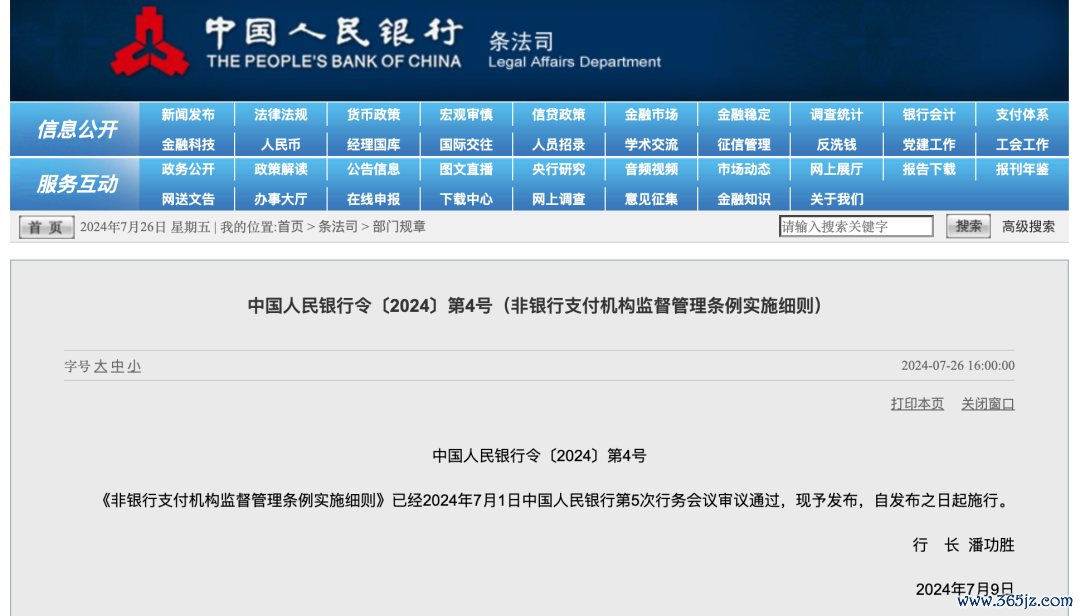 7月26日下午,央行官网发布消息称,近日,中国人民银行出台《非银行支付机构监督管理条例实施细则》(以下简称《实施细则》),自发布之日起施行。