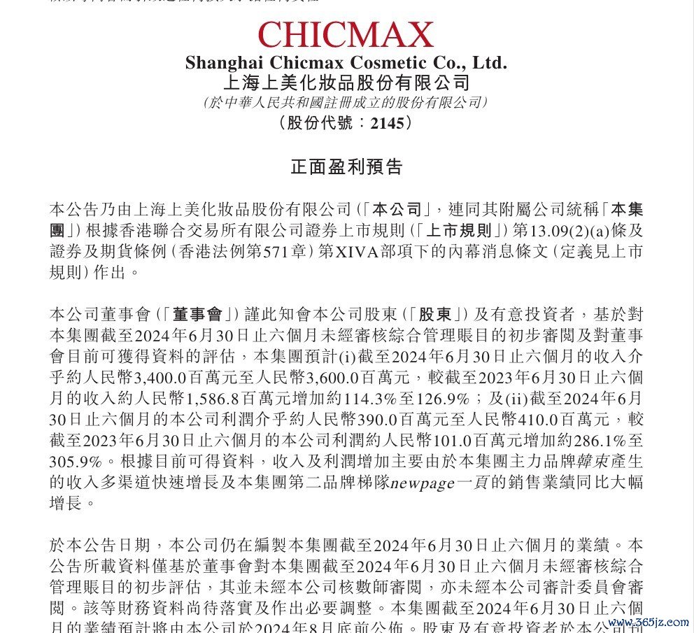 国货美妆上市公司上美股份(2145.HK)近日发布了正面盈利预告。公告显示,截至2024年6月30日止六个月,上美股份营收预计将达到34亿元~36亿元人民币,同比增长约114.3%~126.9%;净利润预计约3.9亿元~4.1亿元人民币,同比增加约286.1%~305.9%。
