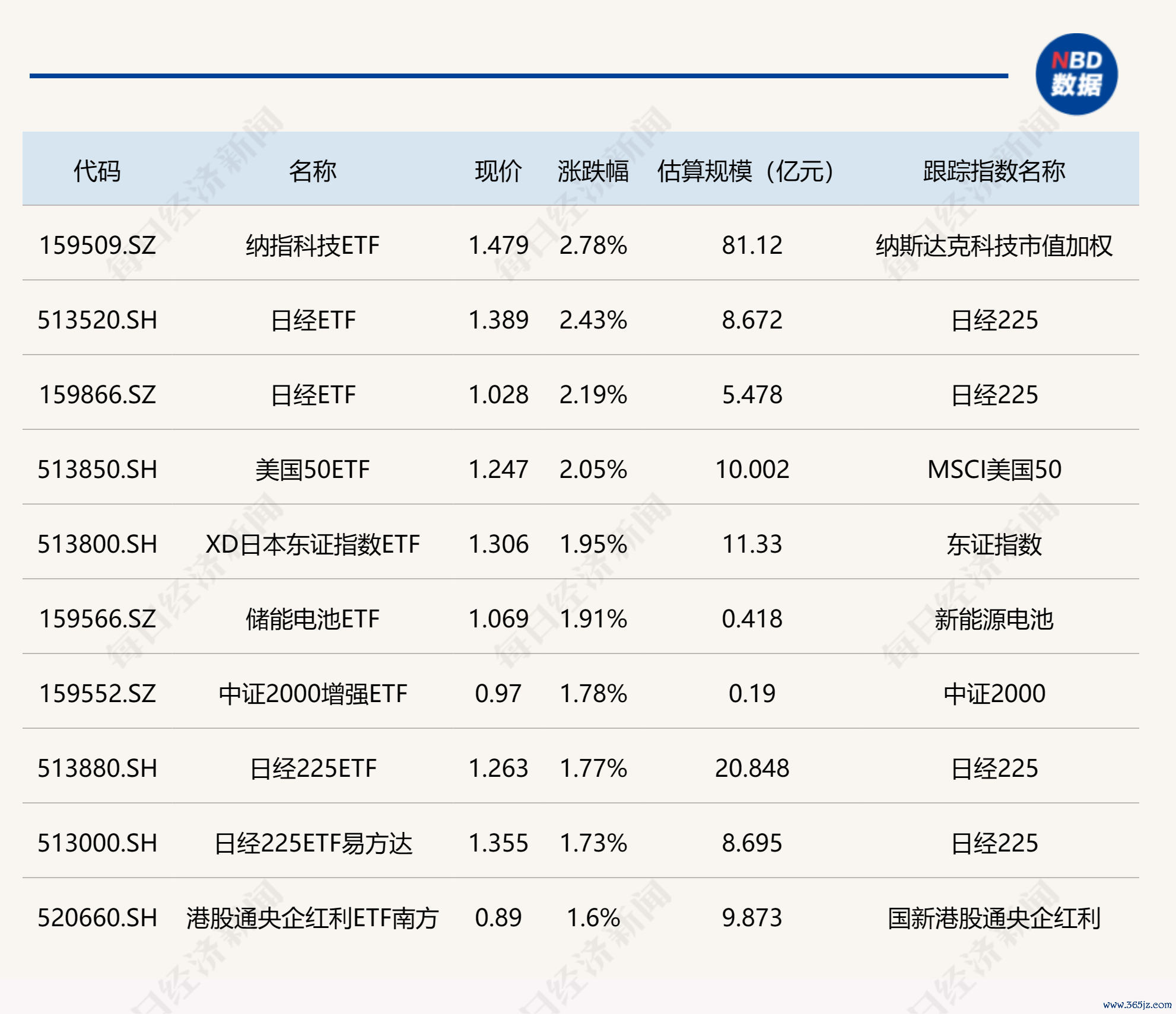 ETF涨跌幅方面,纳指科技、日经等ETF涨逾2%。