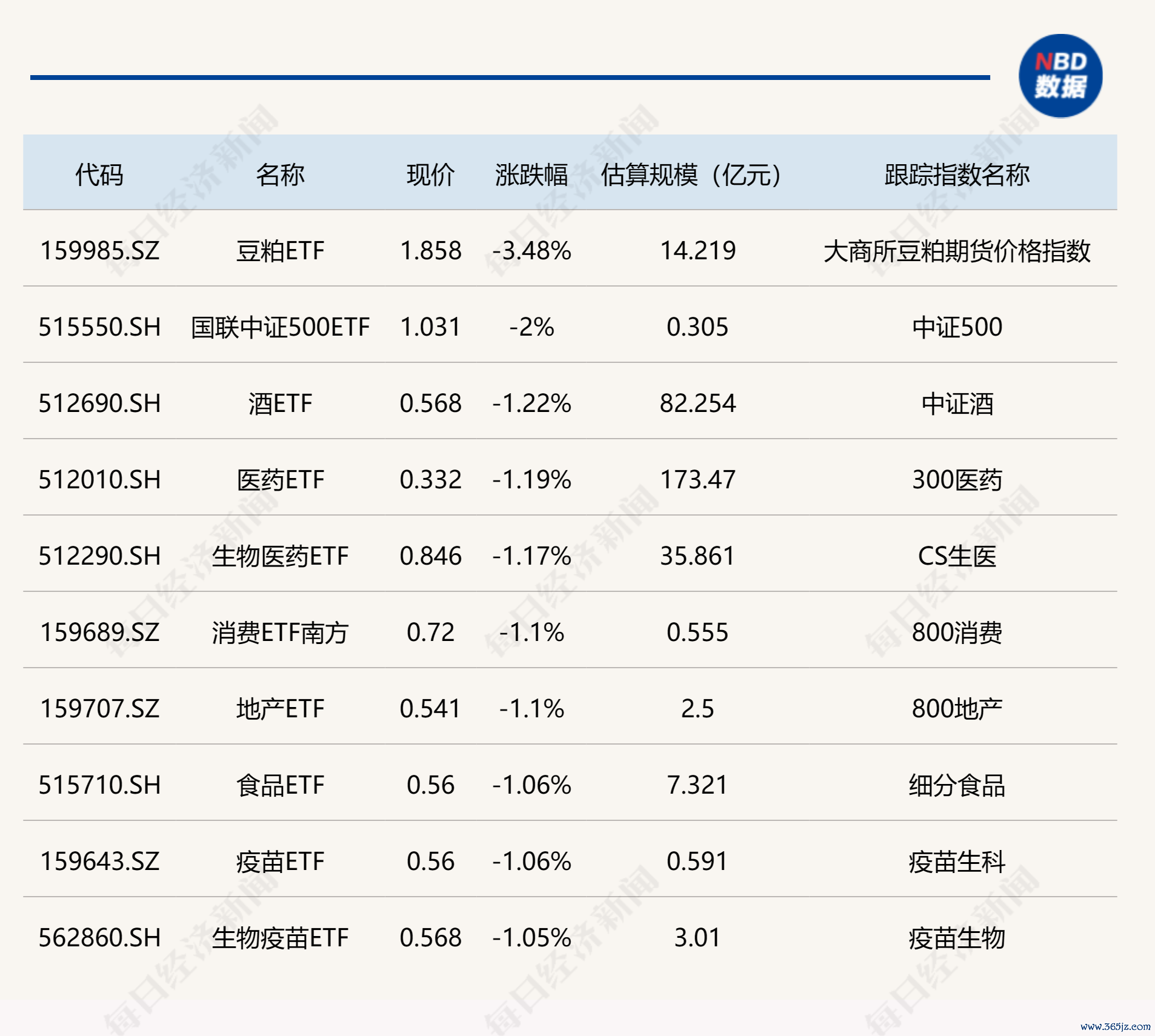 下跌方面,豆粕ETF跌逾3%,酒、医药等ETF跌逾1%。